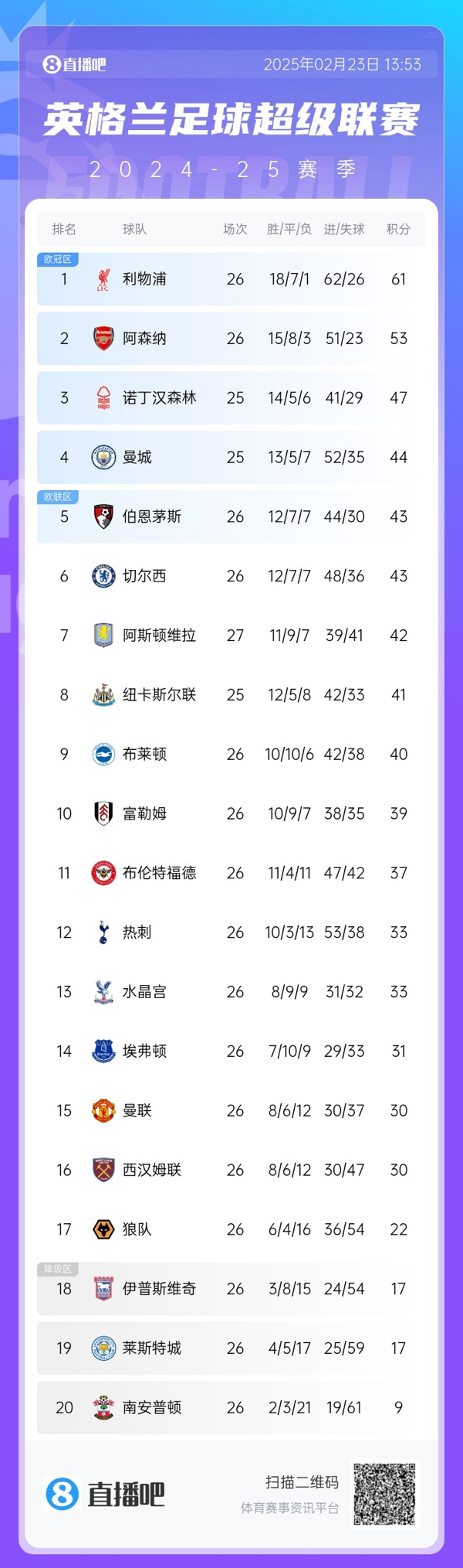 ??2025年02月23日 德甲-多特6-0柏林聯(lián)合聯(lián)賽近8輪首勝 吉拉西大四喜格羅斯四助攻 ??2025年02月23日 終結(jié)兩連平!馬競(jìng)3-0瓦倫西亞 阿爾瓦雷斯雙響+失單刀科雷亞破門 ??2025年02月23日 法甲-哈拉爾德松梅開二度 里爾主場(chǎng)2-1摩納哥 ??2025年02月23日 西甲-德弗魯托斯染紅阿約澤-佩雷斯制勝 比利亞雷亞爾1-0巴列卡諾 ??2025年02月23日 兩輪不勝!切爾西1-2遭維拉絕殺 阿森西奧雙響+絕殺拉師傅兩助攻 ??2025年02月23日 英超-若昂-佩德羅傳射三笘薫破門 布萊頓4-0南安普頓各賽事3連勝 ??2025年02月23日 英超-穆尼奧斯破門 水晶宮2-0終結(jié)富勒姆3連勝 ??2025年02月23日 英超-扎巴尼染紅庫(kù)尼亞破門制勝 狼隊(duì)客場(chǎng)1-0伯恩茅斯 ??2025年02月23日 德甲-毛里斯15分鐘帽子戲法 奧格斯堡客場(chǎng)3-0門興 ??2025年02月23日 德甲-馬索維奇破門斯萬(wàn)貝里扳平 沃爾夫斯堡1-1戰(zhàn)平波鴻 ??2025年02月23日 德甲-李在城替補(bǔ)傳射內(nèi)部二破門 美因茨2-0圣保利 ??2025年02月23日 德甲-勒沃庫(kù)森2-0基爾先賽落后5分 ??似崎T阿德利建功 ??2025年02月23日 夢(mèng)游!AC米蘭1-2都靈近4場(chǎng)僅1勝 邁尼昂失誤佳夫?yàn)觚埰绽髌媸c(diǎn) ??2025年02月23日 意甲-邦尼破門索姆建功 帕爾馬主場(chǎng)2-0博洛尼亞 ??2025年02月23日 意甲-雙方均無(wú)建樹 拉齊奧客場(chǎng)0-0威尼斯
