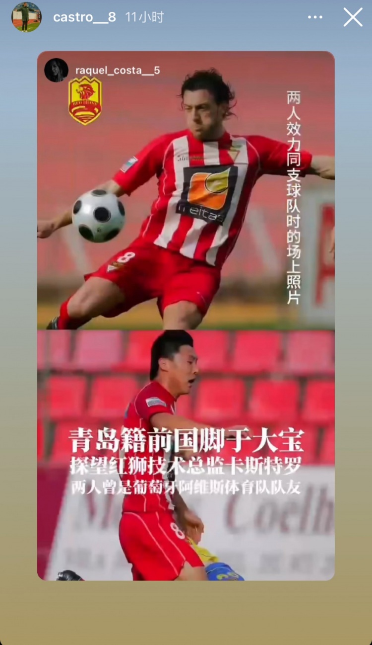 卡斯特羅在社媒曬出他倆的合影并配文介紹寫道:“在葡萄牙時(shí)我們是隊(duì)友,17年后我們以教練身份在中國(guó)相聚。”
