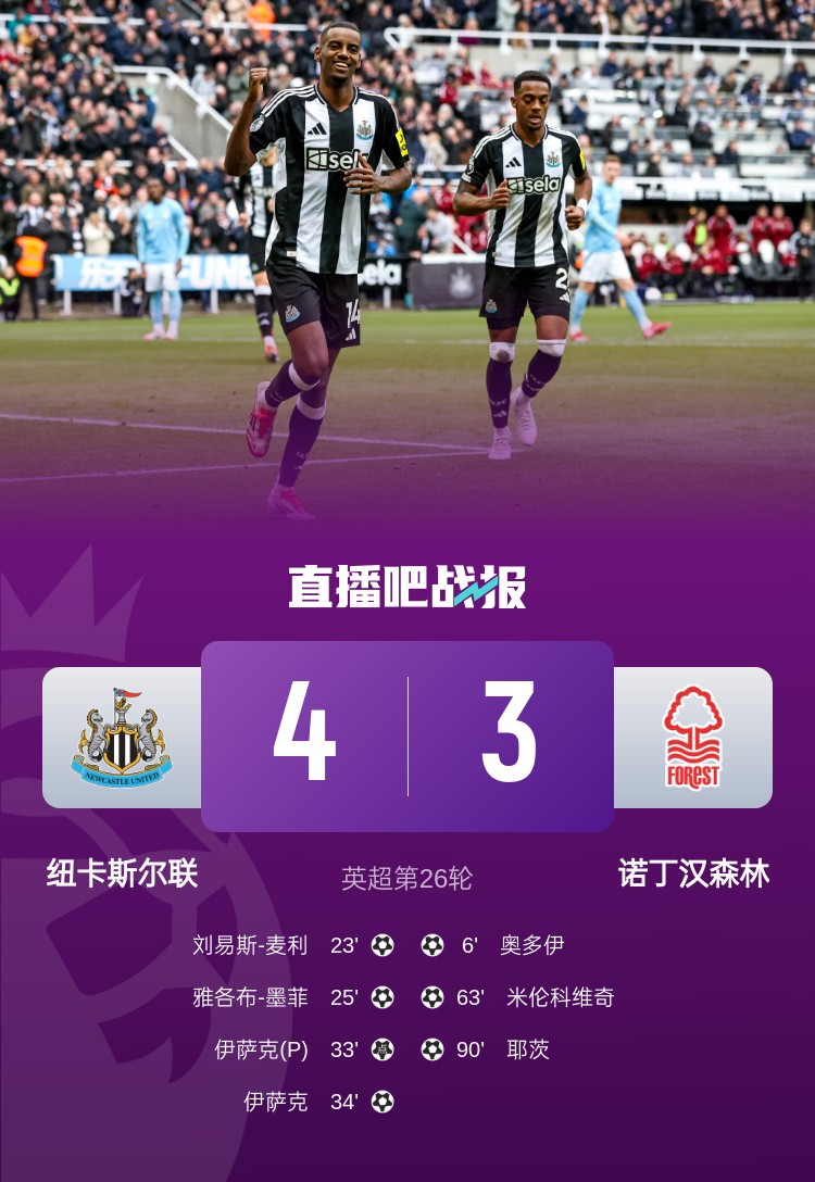 英超第26輪,紐卡4-3諾丁漢森林。上半場,奧多伊前場斷球后轟出世界波破門,麥利和墨菲3分鐘內(nèi)連進兩球,埃納手球送點,伊薩克點射得手,隨后他梅開二度;下半場,沙爾頭球中柱,米倫科維奇蝎子擺尾扳回一球,耶茨補時階段再追一球。