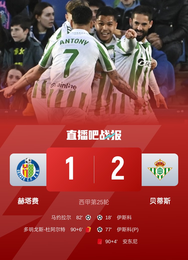 西甲第25輪,貝蒂斯2-1擊敗赫塔費。上半場,安東尼長途奔襲連續(xù)過人助攻伊斯科破門;下半場,安東尼錯失良機,庫喬造點,伊斯科點射完成雙響,馬約拉爾扳回一球,補時安東尼背后鏟人被直紅罰下,多明戈斯-杜阿爾特2黃變1紅也被罰下。