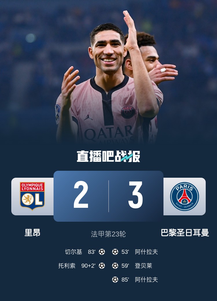 法甲第23輪,巴黎圣日耳曼3-2里昂。上半場,阿什拉夫犯規(guī)染黃,雙方互交白卷;下半場,阿什拉夫打入兩球上演梅開二度,登貝萊破門打入個人聯(lián)賽第17球,切爾基和托利索為里昂扳回兩球。