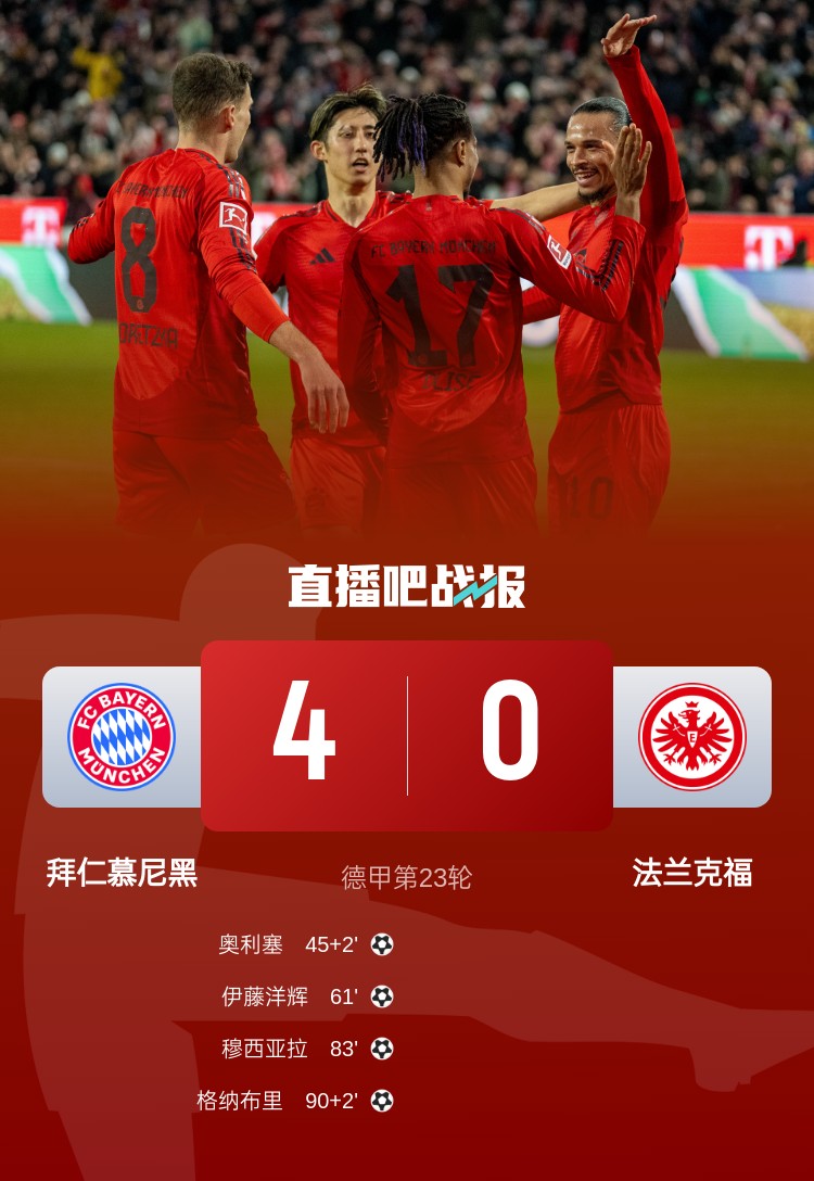 德甲第23輪,拜仁4-0法蘭克福。上半場,基米希傷退,奧利塞破門;下半場,伊藤洋輝打進自己的拜仁生涯首球,穆西亞拉一條龍,格納布里錦上添花。
