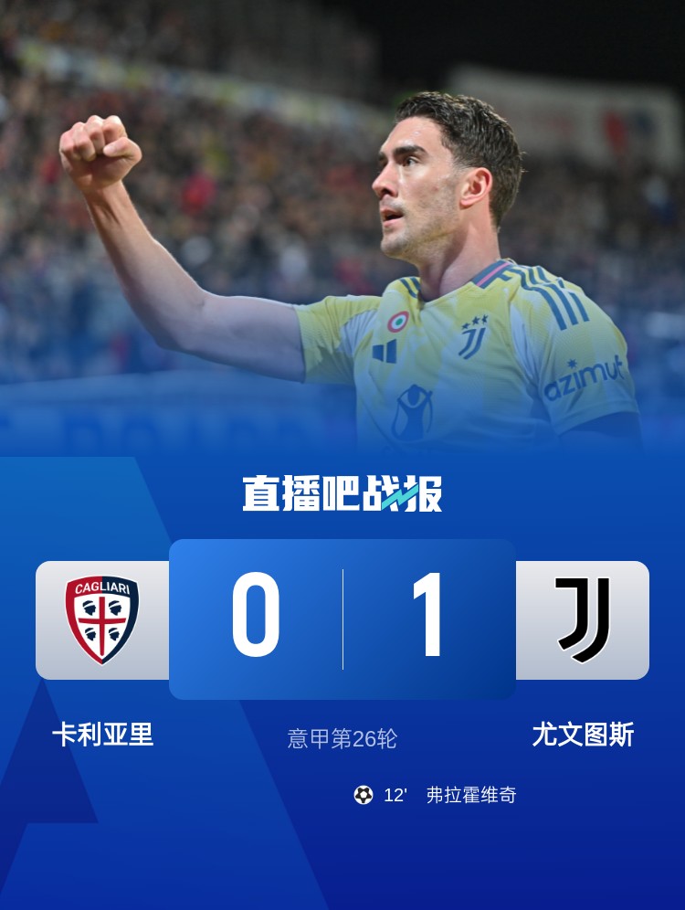 意甲第26輪,尤文1-0卡利亞里,聯(lián)賽4連勝。上半場,弗拉霍維奇過掉門將小角度破門;下半場,坎比亞索傷退,替補出場僅20分鐘的道格拉斯-路易斯也傷退。