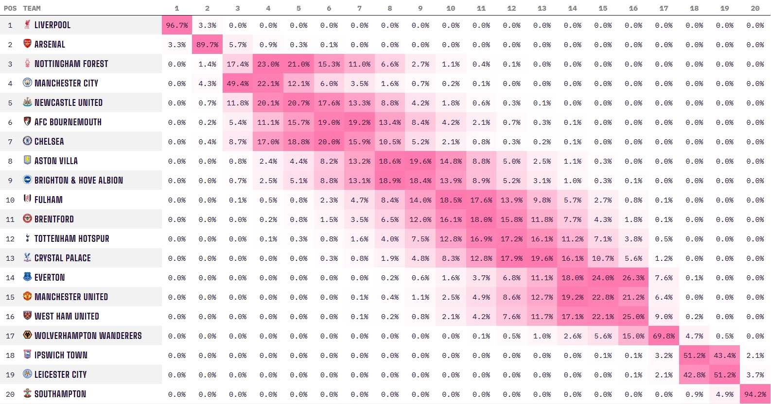 穩(wěn)了??利物浦最新英超奪冠概率高達(dá)96.7%,阿森納3.3% 曼城歸0