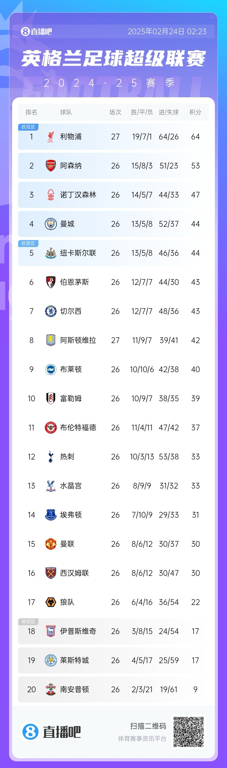 02月24日訊 曼城主場不敵利物浦,26輪英超后積44分位居第4。