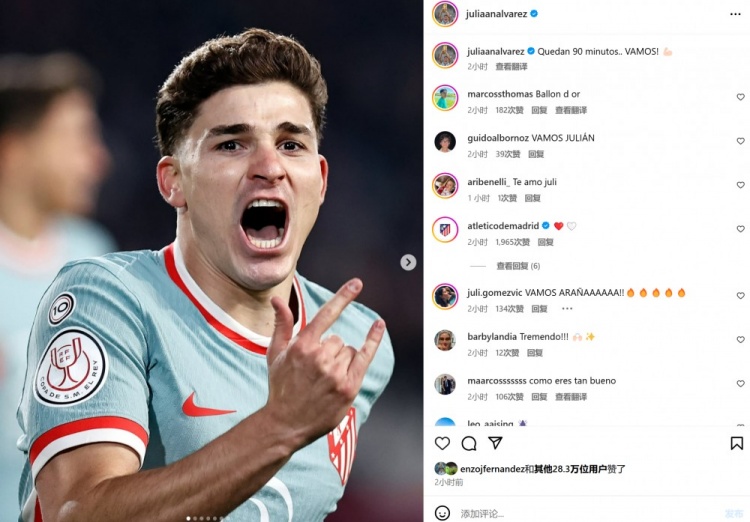 本場(chǎng)比賽阿爾瓦雷斯一傳一射表現(xiàn)出色,賽后他也在個(gè)人社媒曬出本場(chǎng)慶祝進(jìn)球的照片,配文寫道:“還有90分鐘比賽,我們繼續(xù)加油!”