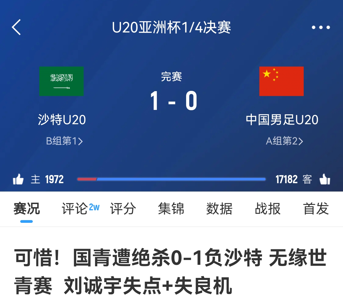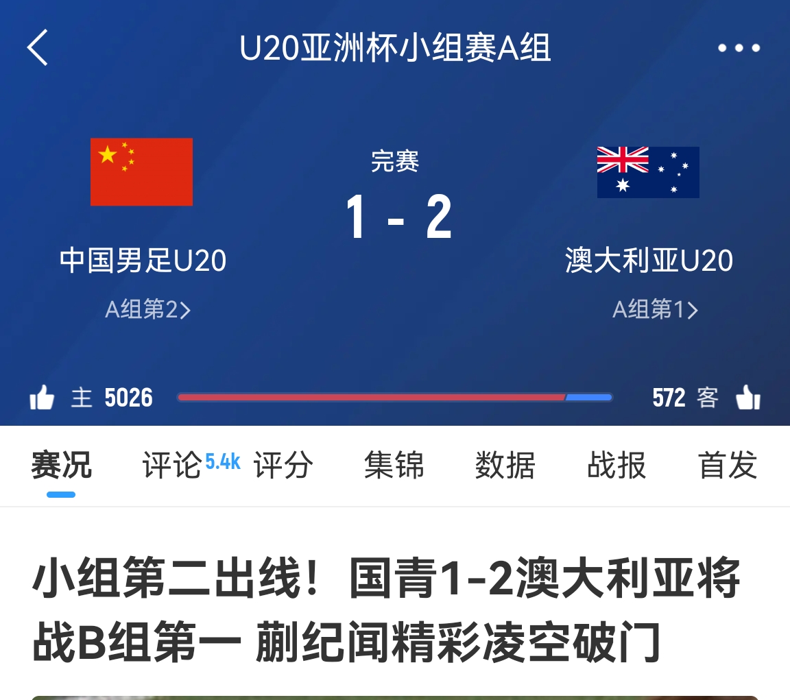 而在本屆亞青賽中,國青正是輸給了晉級決賽的兩支球隊。在小組賽中,國青1-2不敵澳大利亞U20,無緣小組第一,在隨后的1/4決賽中,國青又0-1不敵沙特U20,止步8強,同時也失去了今年世青賽的門票。