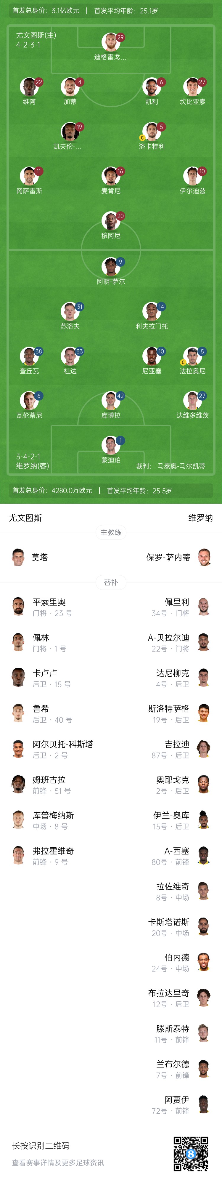尤文替補(bǔ):1-佩林、23-平索里奧、42-蒙特羅、15-卡盧盧、40-魯希、8-庫普梅納斯、9-弗拉霍維奇、51-姆班古拉