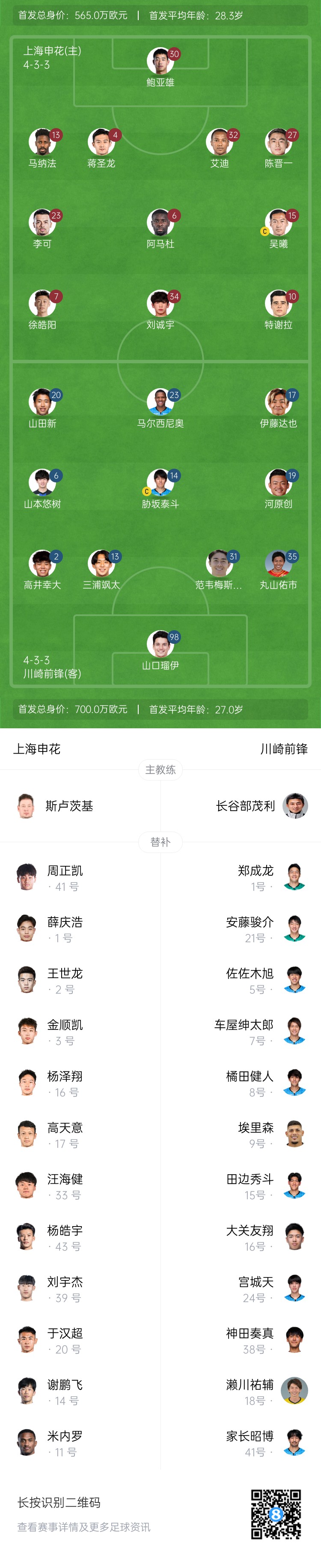 申花vs川崎首發(fā):18歲劉誠宇首次先發(fā)!蔣圣龍、李可、徐皓陽出戰(zhàn)