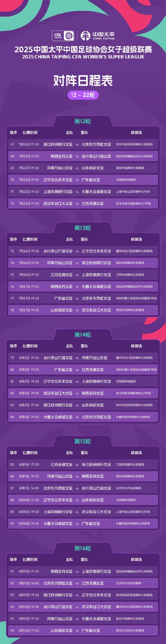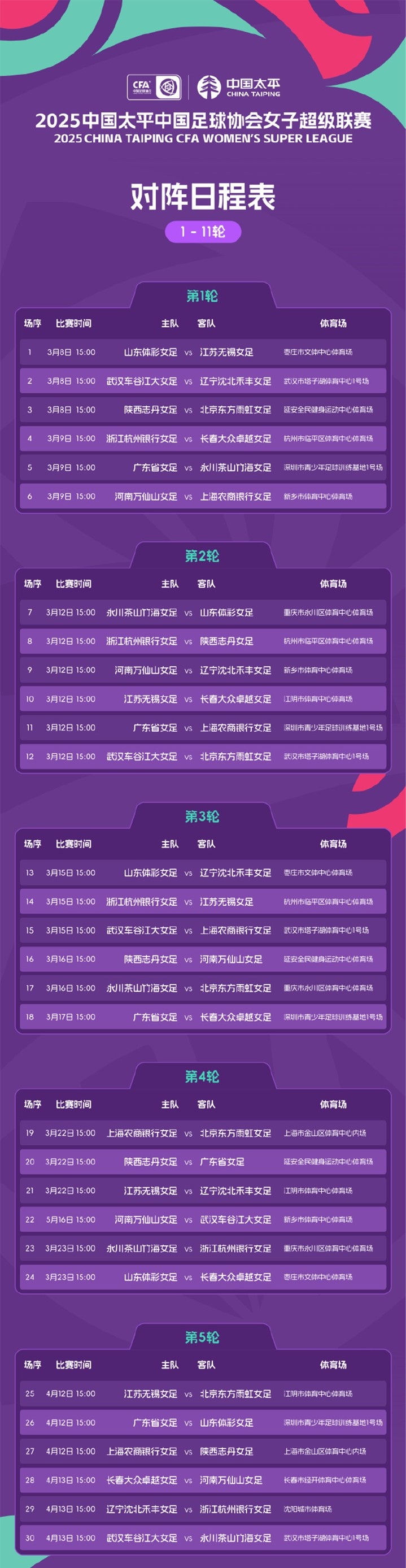 2025中國(guó)太平中國(guó)足球協(xié)會(huì)女子超級(jí)聯(lián)賽對(duì)陣日程表