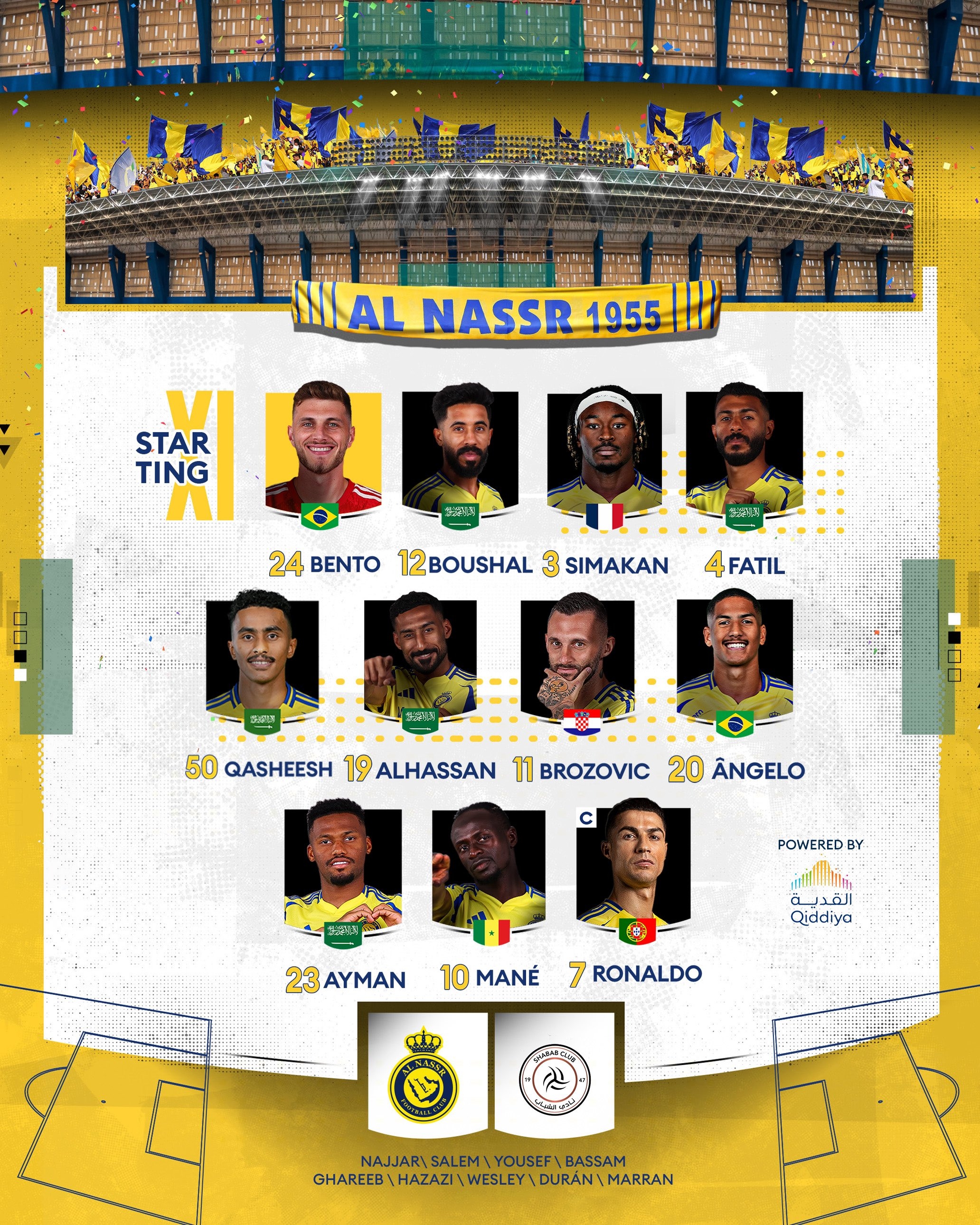3月8日訊 沙特聯(lián)第24輪,利雅得勝利主場(chǎng)對(duì)陣?yán)诺们嗄耆恕Y惽?,官方公布了本?chǎng)的首發(fā)名單。