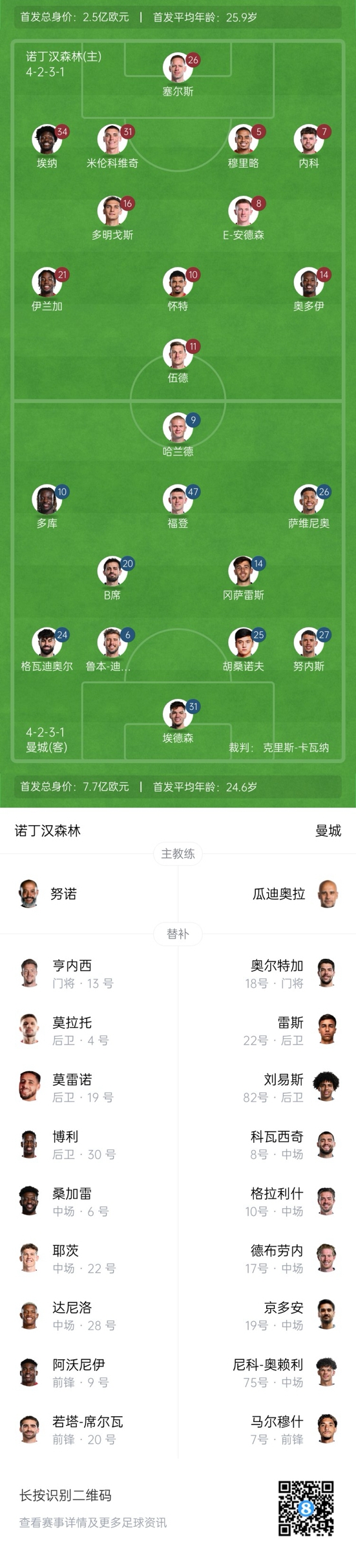 曼城客戰(zhàn)森林首發(fā):哈蘭德PK伍德!胡桑諾夫先發(fā),馬爾穆什替補
