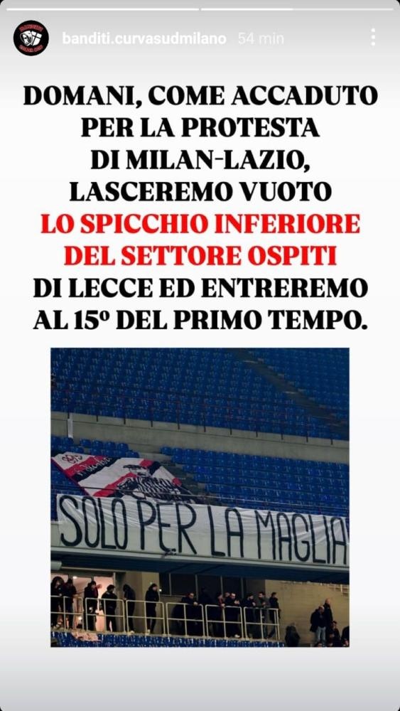 米蘭南看臺球迷組織在社交平臺上宣布:“明天,就像米蘭-拉齊奧時發(fā)生的抗議一樣,我們將會在萊切球場客隊坐區(qū)制造一片空場,我們將會從上半場第15分鐘再進場?!?/p>