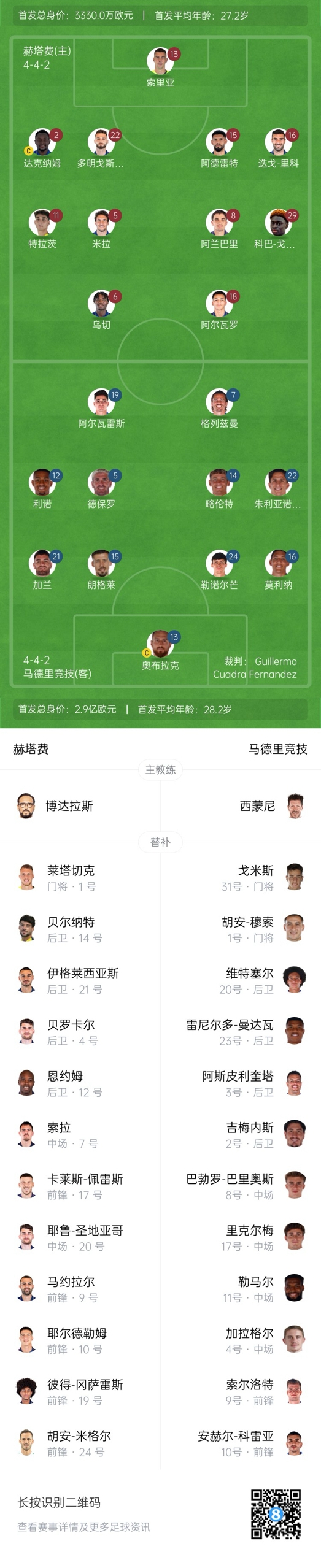 赫塔費(fèi)首發(fā):13-索里亞、2-杰內(nèi)、5-米拉、6-烏切、8-阿蘭巴里、11-特拉茨、15-阿爾德雷特、16-里科、18-阿爾瓦羅-羅德里格斯、22-多明戈斯-杜阿爾特、29-科巴-達(dá)科斯塔
