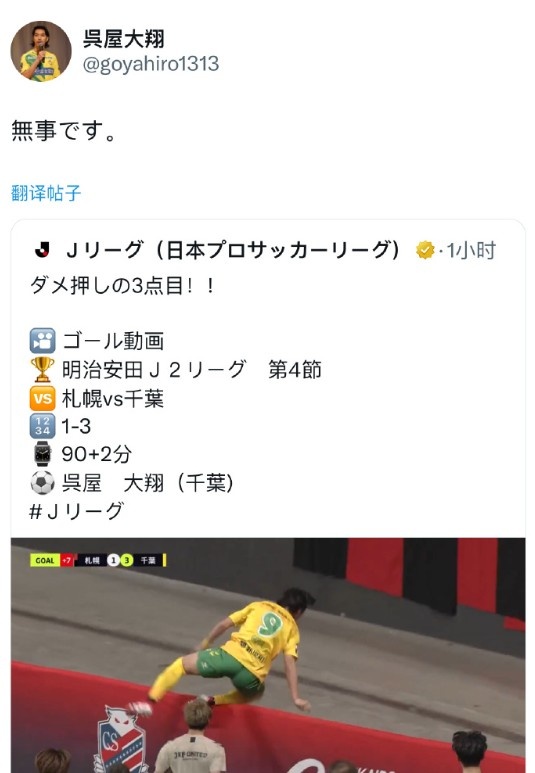 好在經(jīng)過一番檢查,吳屋大翔并無大礙,并回到球場繼續(xù)比賽,比賽結(jié)束后,吳屋大翔也轉(zhuǎn)發(fā)了自己“出糗”視頻,并寫道“平安無事?!?,再次讓球迷們安心。