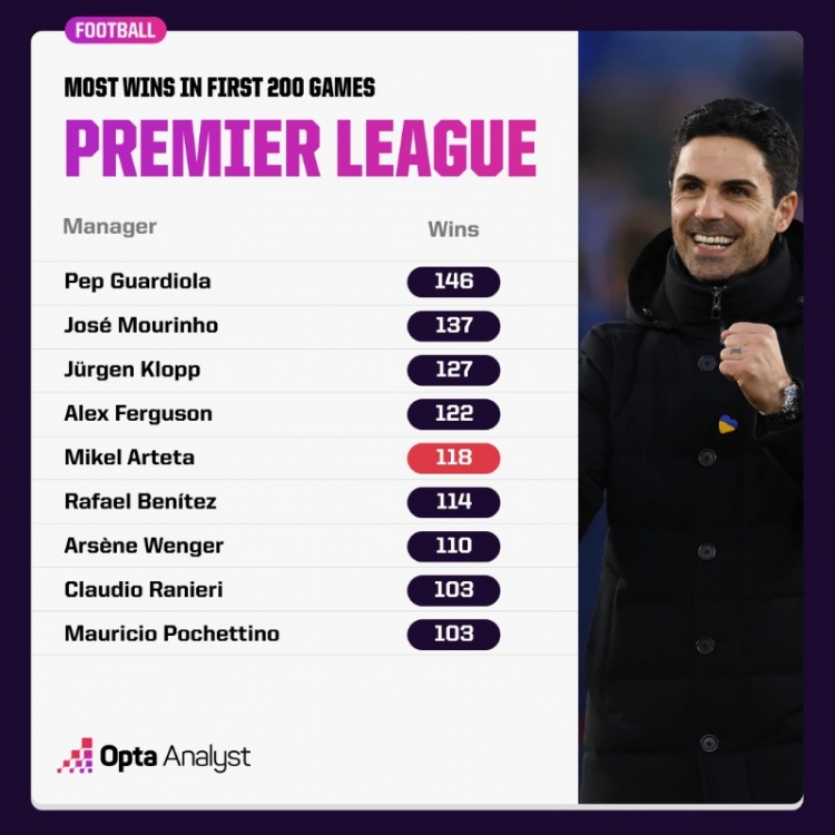 3月10日訊 阿森納在本輪英超焦點戰(zhàn)客場1-1戰(zhàn)平曼聯(lián),阿爾特塔在個人執(zhí)教英超200場里程碑未能獲得勝利。不過數(shù)據(jù)統(tǒng)計顯示,他仍然是英超歷史200場勝率第5高的主教練。