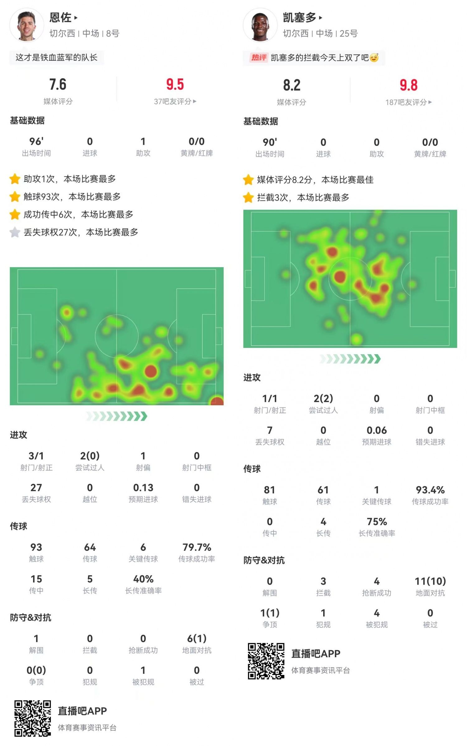 本場比賽恩佐與凱塞多的發(fā)揮可圈可點。“嘗試助攻王”恩佐總算“撿”到一個助攻,庫庫雷利亞的制勝球便是由恩佐傳導。凱塞多則繼續(xù)自己的戰(zhàn)神級發(fā)揮,本場比賽貢獻12次對抗11次成功,還有3攔截4搶斷0被過的鐵閘表現(xiàn)。切爾西的雙腰進可攻退可守,正是藍軍本賽季戰(zhàn)績不錯的原因之一。