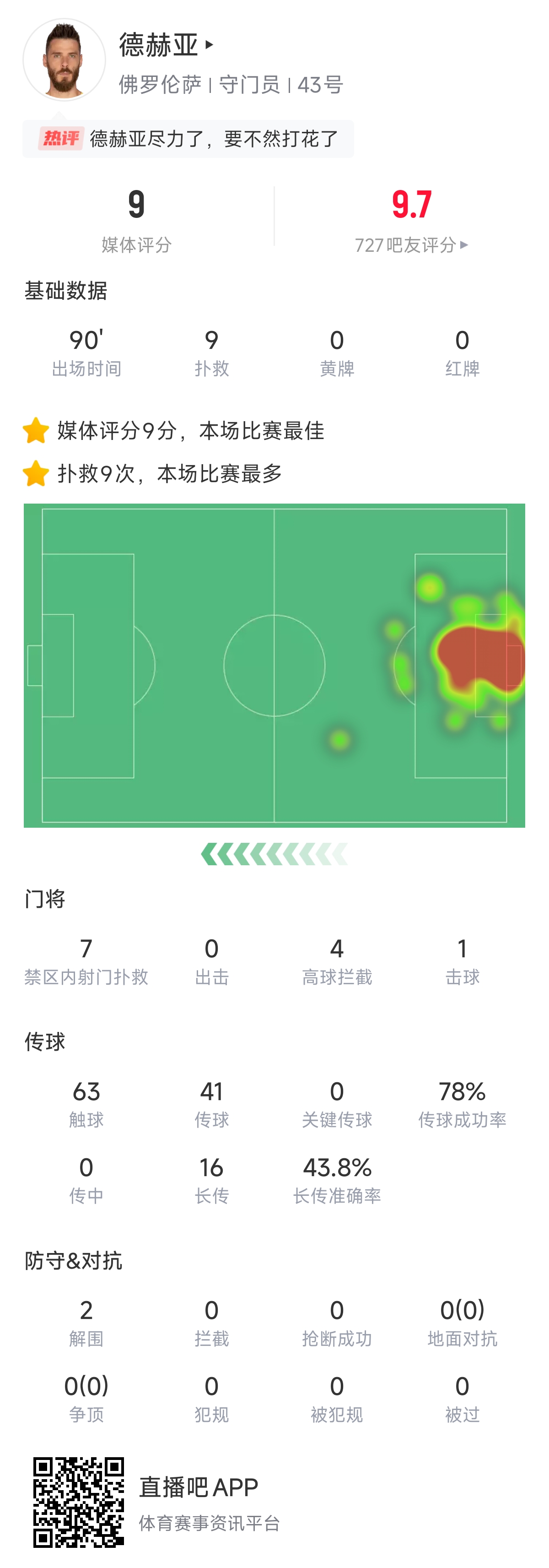 你撲你也麻!德赫亞被轟19腳僅丟2球,貢獻9撲救4攔截2解圍1擊球