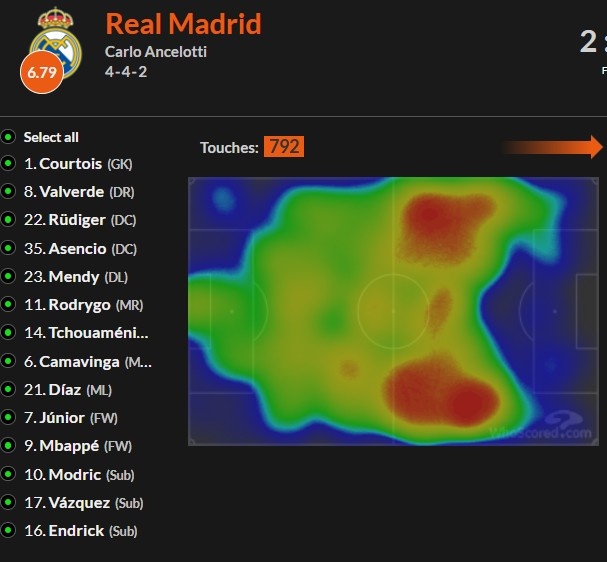 可以想到,因為在缺少大中鋒的情況下,他們不可能按照過去有中鋒時(哪怕是何塞-盧)那樣的傳中、搶點、后排套上爭搶機會模式來打了。維尼修斯、羅德里戈、包括姆巴佩都是在突擊方面遠勝過被迫的站樁方面效率選手,因此,他們也會自主扯到邊路來踢球。