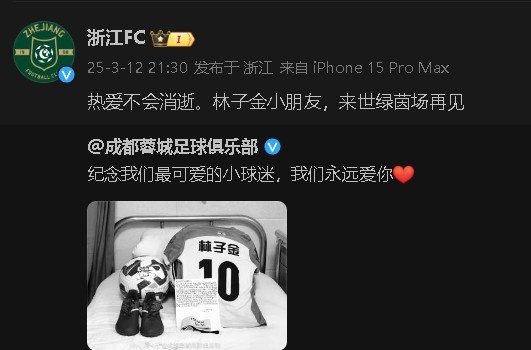 浙江隊社媒發(fā)文悼念:熱愛不會消逝,林子金小朋友來世綠茵場再見