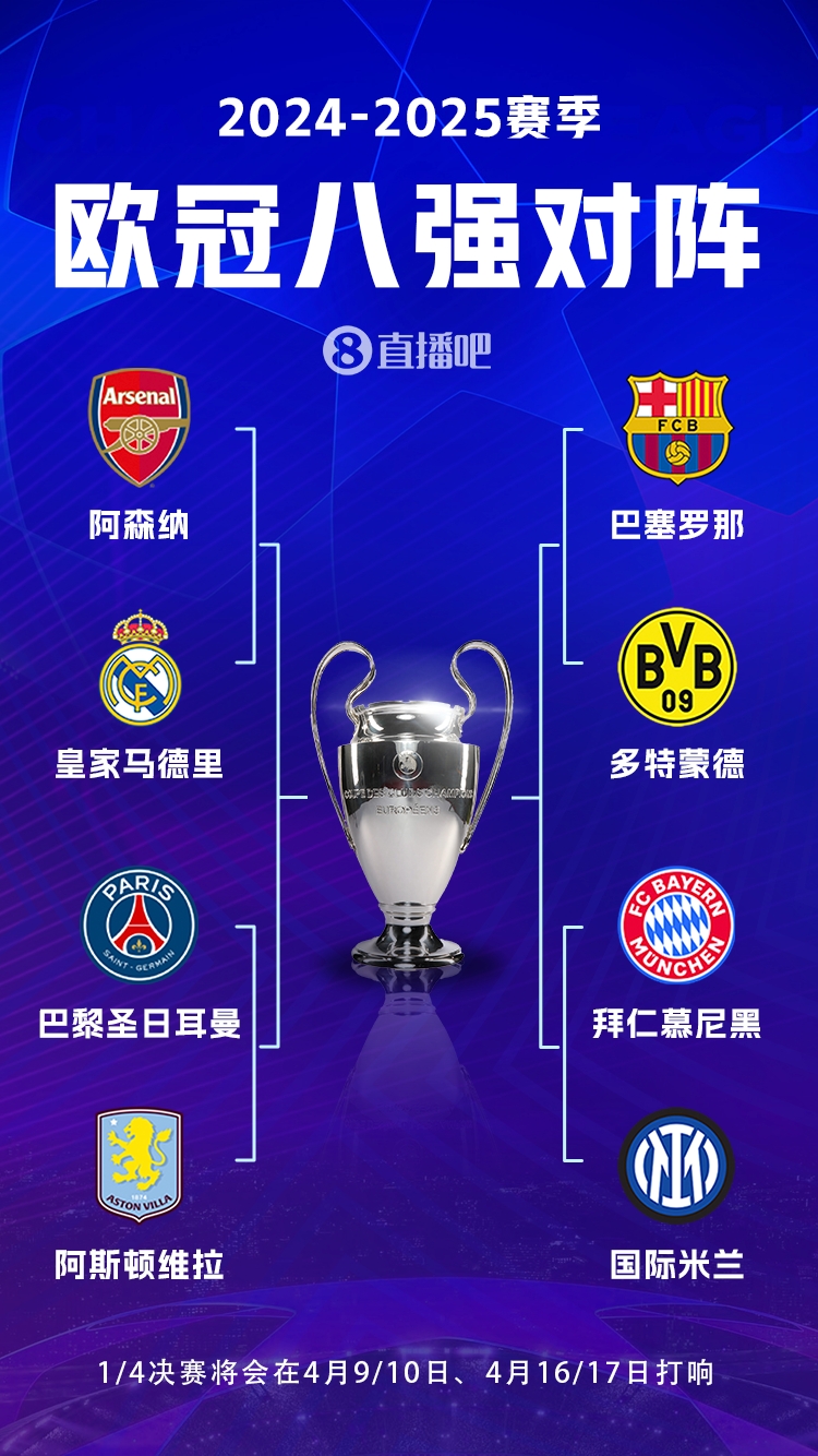 歐冠1/4決賽賽程:阿森納對(duì)皇馬下月9號(hào)打響,巴薩4月10日出戰(zhàn)