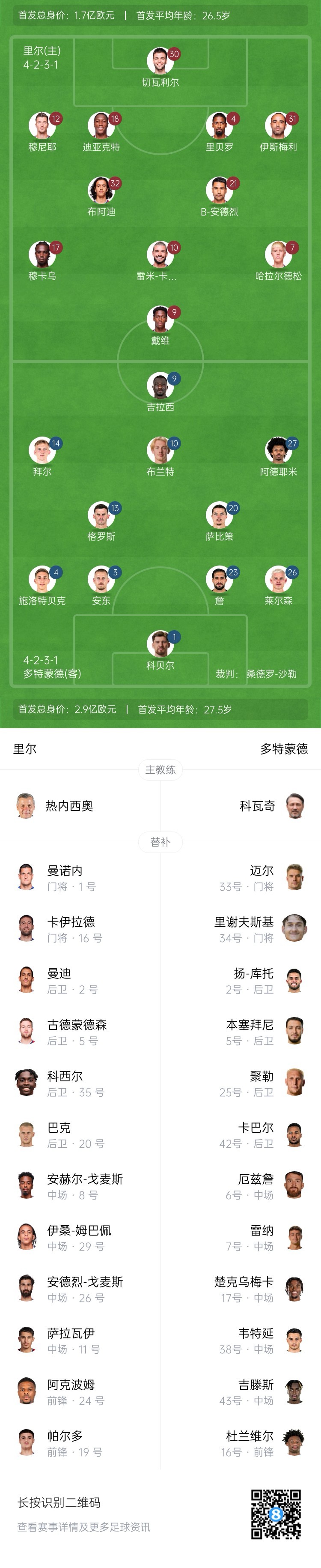 里爾替補:1-曼諾內、16-卡伊拉德、2-曼迪、5-古德蒙德松、35-科西爾、20-巴克、8-安赫爾-戈麥斯、29-伊桑-姆巴佩、26-安德烈-戈麥斯、11-薩拉瓦伊、24-阿克波姆、19-帕爾多