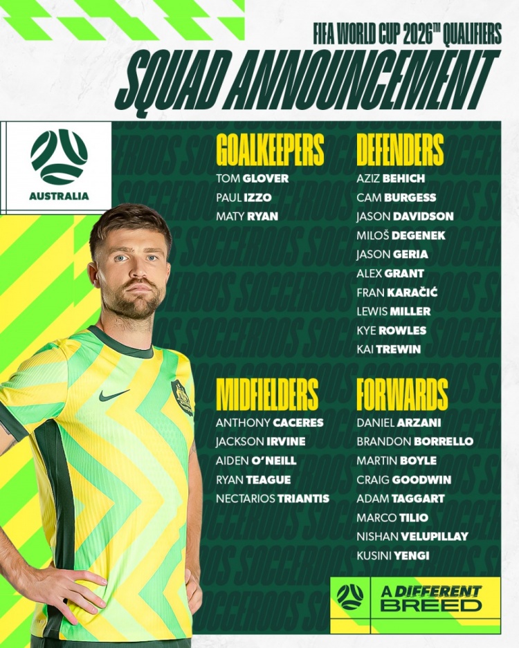 【相關(guān)】澳大利亞隊(duì)世預(yù)賽名單:“人民球王”古德溫領(lǐng)銜,3月25號對國足