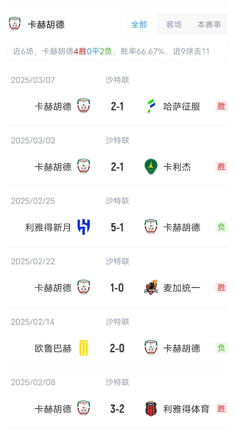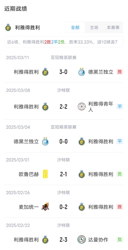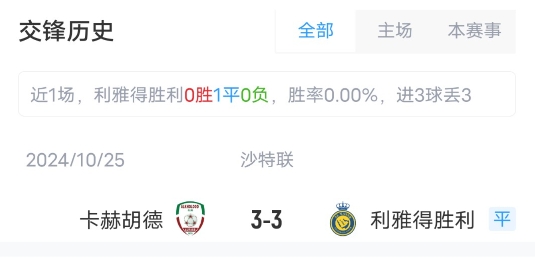 目前利雅得勝利取得了14勝6平4負(fù)的成績(jī),積48分,暫居聯(lián)賽第4??ê蘸氯〉昧?勝4平11負(fù)成績(jī),積31分,暫居聯(lián)賽第10。