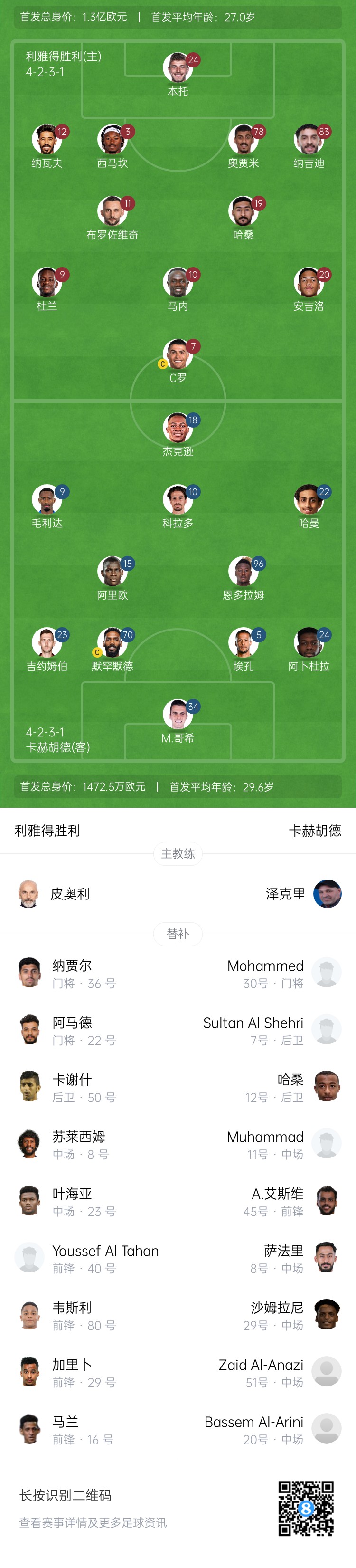 利雅得勝利首發(fā):24-本托、12-納瓦夫、3-西馬坎、78-奧賈米、83-納吉迪、19-哈桑、11-布羅佐維奇、20-安吉洛、10-馬內(nèi)、9-杜蘭、7-C羅