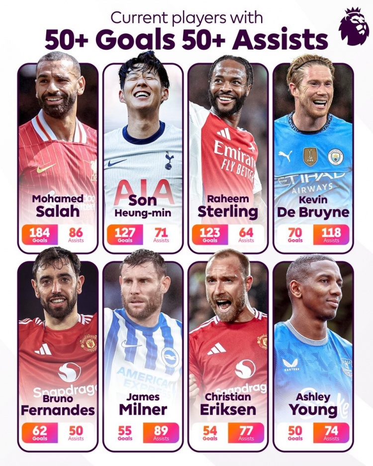 官方統(tǒng)計當前仍效力英超進球+助攻雙50+球員: