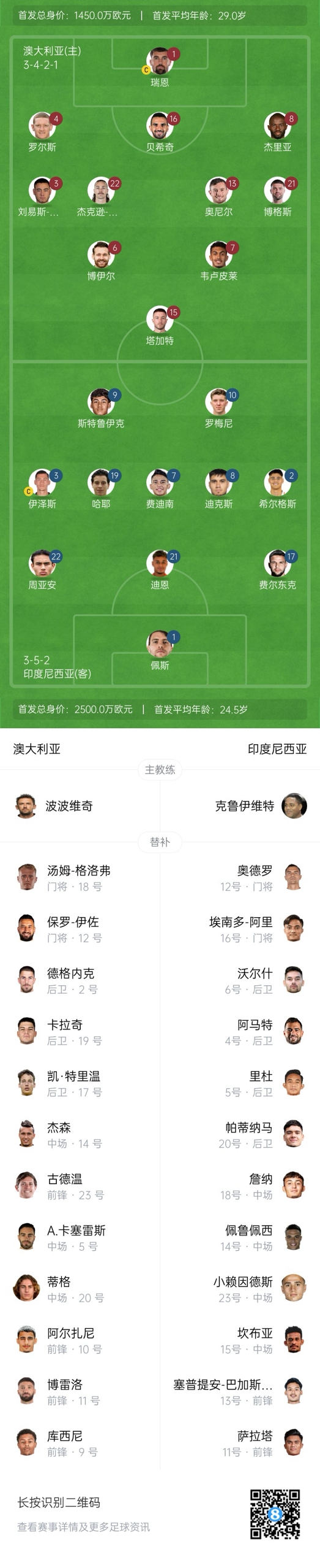 國(guó)足同組!澳大利亞vs印尼首發(fā):印尼先發(fā)10名歸化 古德溫蒂格替補(bǔ)