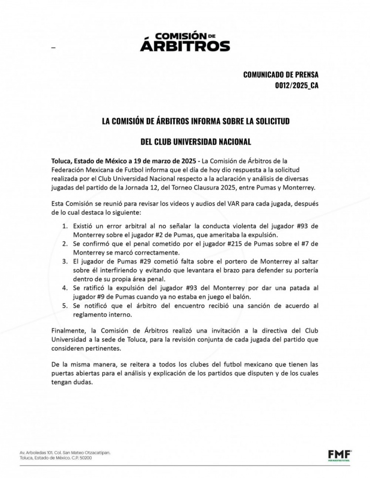 墨西哥美洲獅俱樂(lè)部賽后提出申請(qǐng),希望墨西哥裁判委員會(huì)對(duì)比賽中的判罰做出澄清和分析,裁判委員會(huì)發(fā)布公告,確認(rèn)當(dāng)值主裁存在失誤,拉莫斯上半場(chǎng)肘擊對(duì)手就應(yīng)該被罰下,但裁判沒(méi)有對(duì)其出示紅牌。