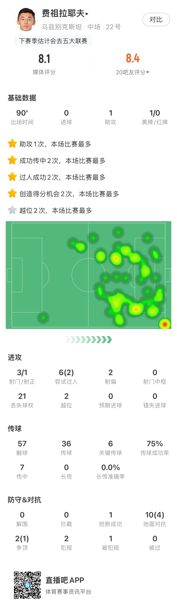 下一站五大聯(lián)賽?烏茲21歲中場費祖拉耶夫1v6挑傳助攻,身價800萬