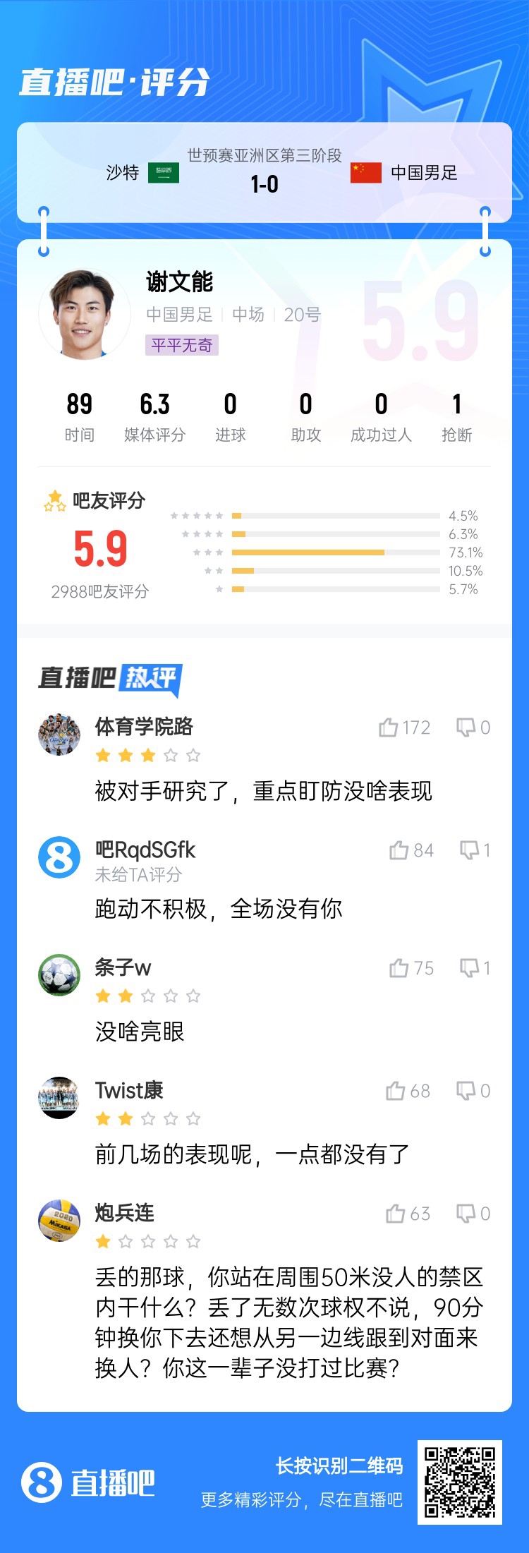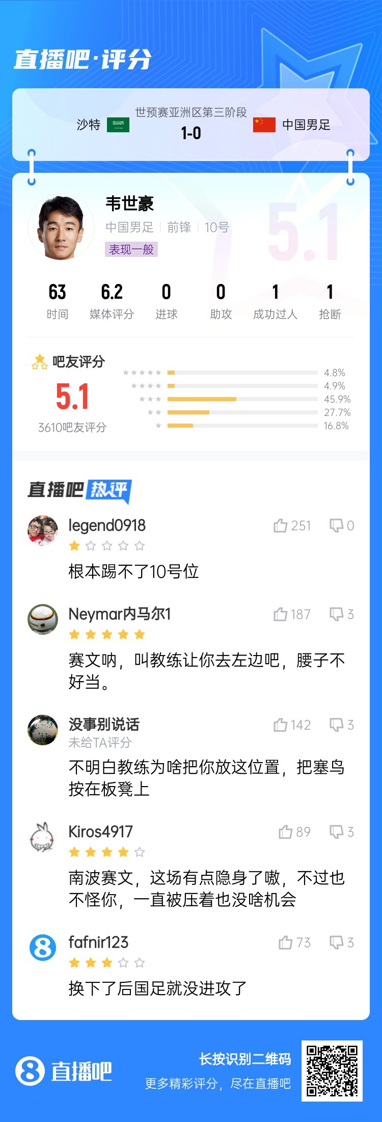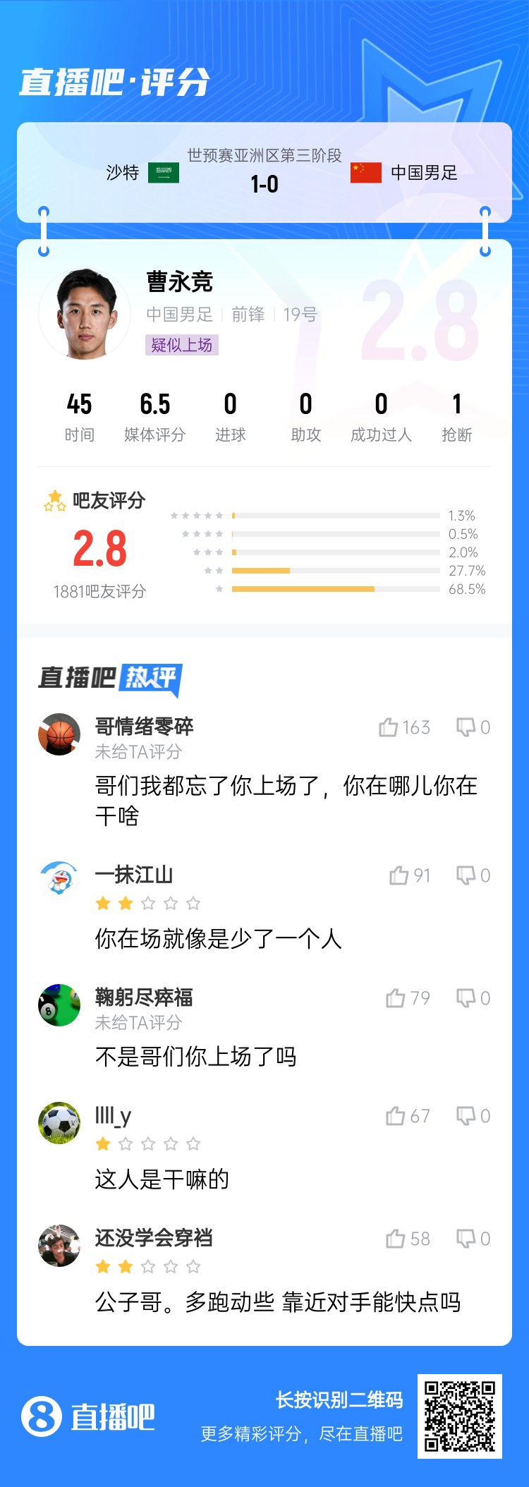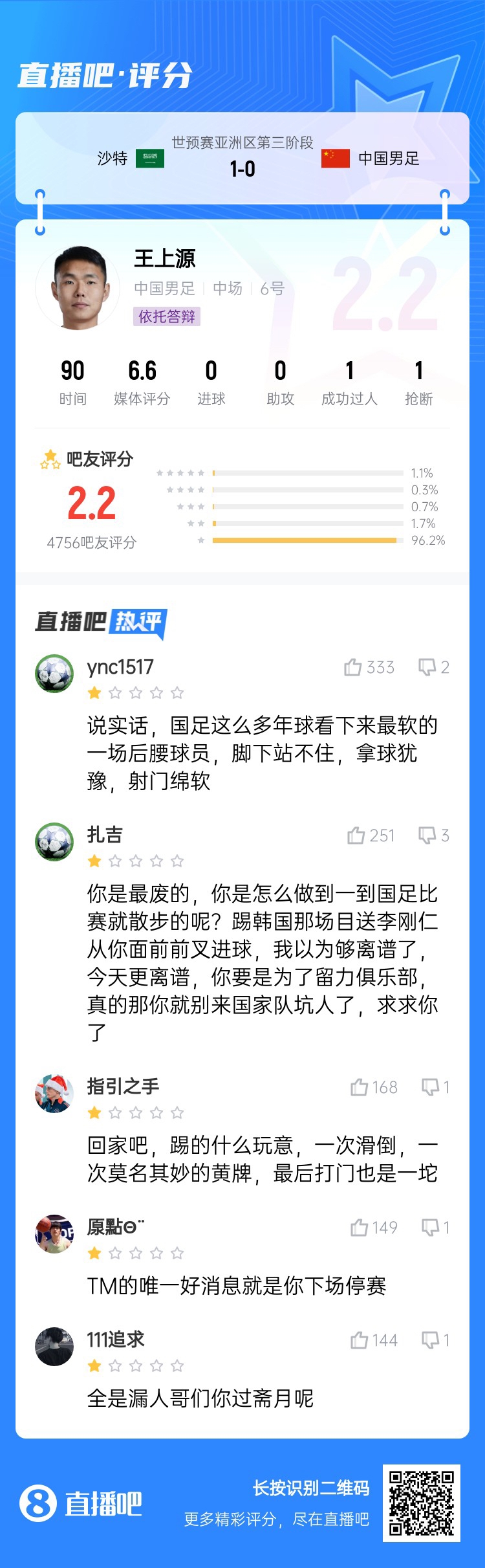 18強(qiáng)賽關(guān)鍵戰(zhàn),國足0-1不敵沙特,沒能擺脫小組墊底。吧友評(píng)分中,國足中場球員普遍低分,韋世豪5.1分,王上源2.2分,曹永競2.8分,謝文能5.9分。