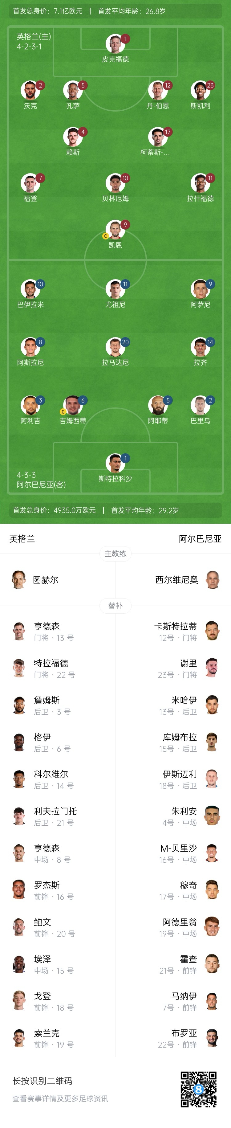 英格蘭首發(fā):1-皮克福德、2-沃克、5-孔薩、12-丹-伯恩、23-斯凱利、4-賴斯、17-柯蒂斯-瓊斯、7-福登、10-貝林厄姆、11-拉什福德、9-凱恩