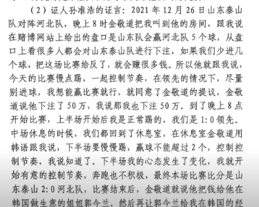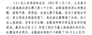 證言中,孫準(zhǔn)浩表示在泰山2-2平海港之前,金敬道說讓慢點踢這場不能贏。賽后,金敬道給孫準(zhǔn)浩20萬人民幣;在2-0河北之前,孫準(zhǔn)浩跟著金敬道下注50萬,這場比賽結(jié)束后金敬道把錢給金敬道姐姐郭今蘭,郭今蘭再給孫準(zhǔn)浩的哥哥。