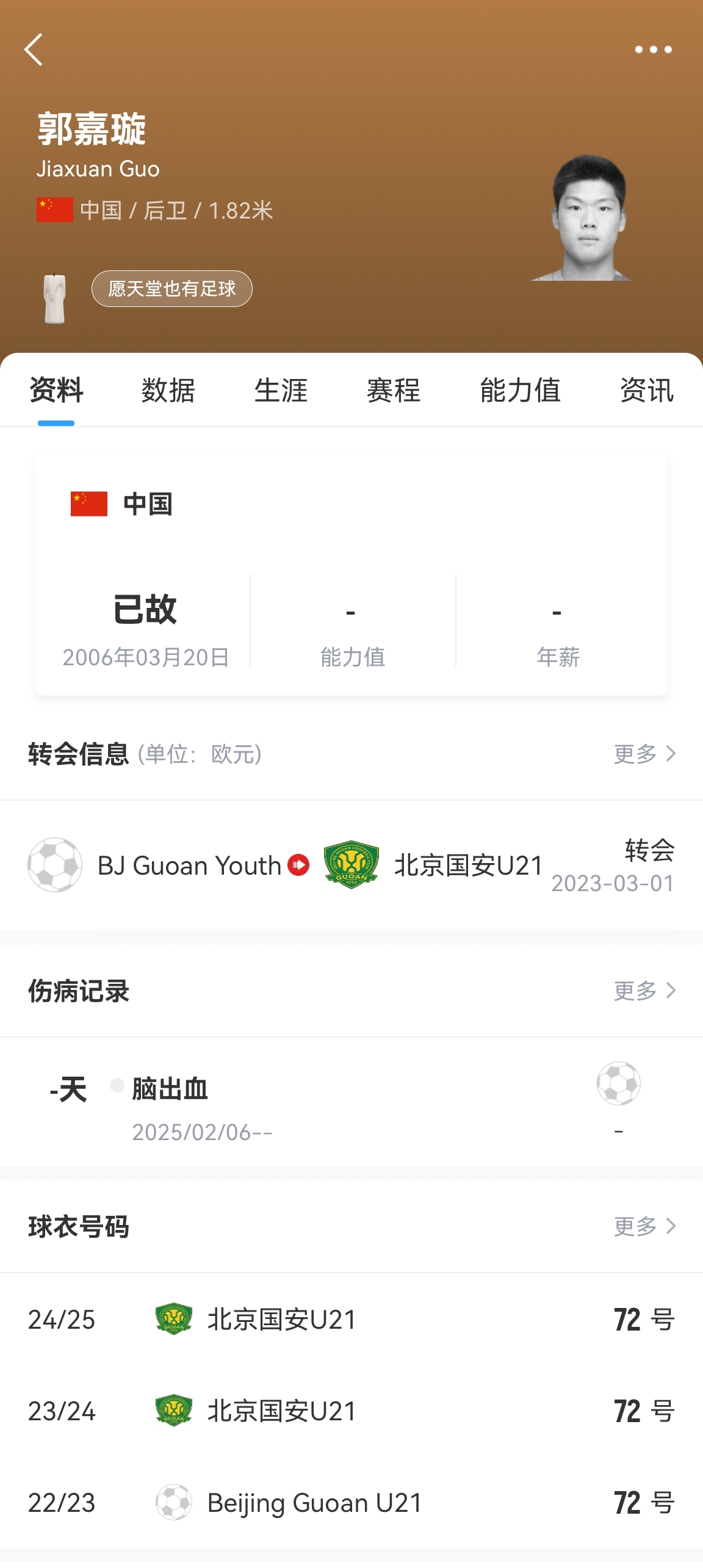 3月19日,國安小將郭嘉璇在天壇醫(yī)院去世,年僅18歲,當時距離他19歲的生日只有1個小時。