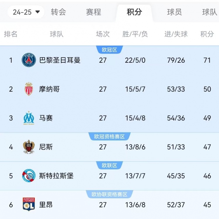 3月30日訊 巴黎在本輪法甲6-1血洗圣埃蒂安,在還剩7輪情況下領(lǐng)先第二名摩納哥多達21分+33凈勝球。