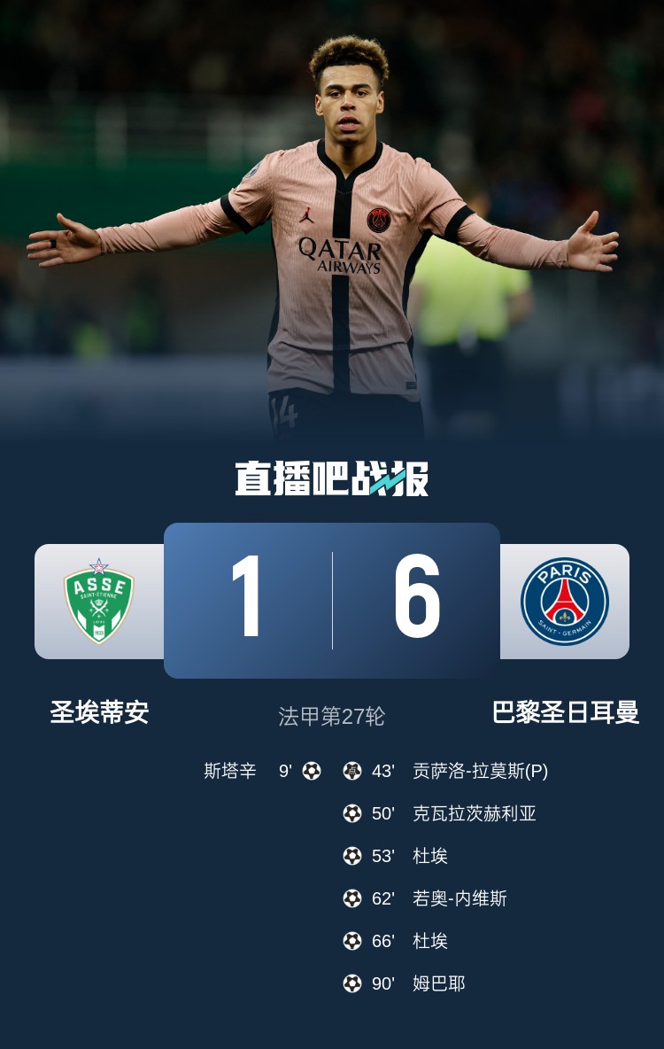 法甲第27輪,巴黎6-1大勝圣埃蒂安,暫以22分優(yōu)勢領跑。上半場,斯塔辛首開紀錄,貢薩洛-拉莫斯點射扳平;下半場,克瓦拉茨赫利亞擴大比分,內(nèi)維斯破門,杜埃梅開二度,姆巴耶打進一球。