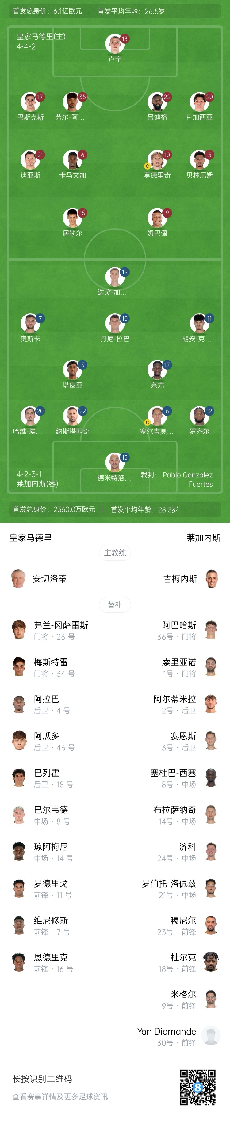 皇馬vs萊加內(nèi)斯首發(fā):姆巴佩領(lǐng)銜 維尼修斯替補(bǔ) 居勒爾&魔笛先發(fā)