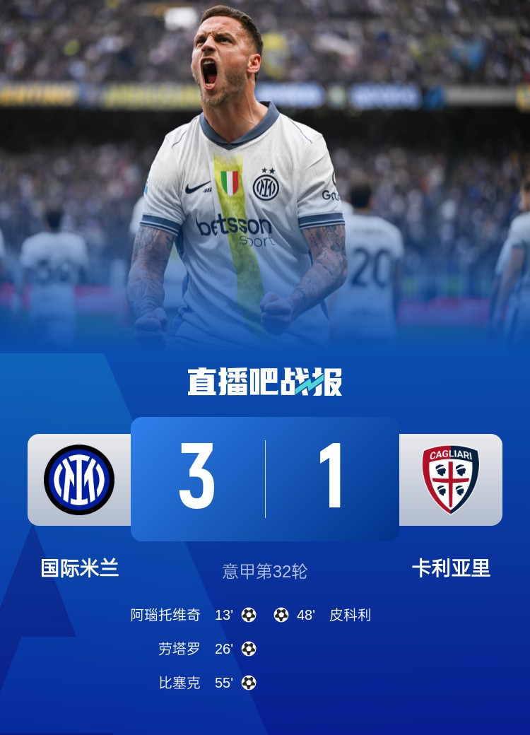 意甲第32輪,國米3-1卡利亞里,阿瑙托維奇?zhèn)魃洌瑒谒_進(jìn)球。