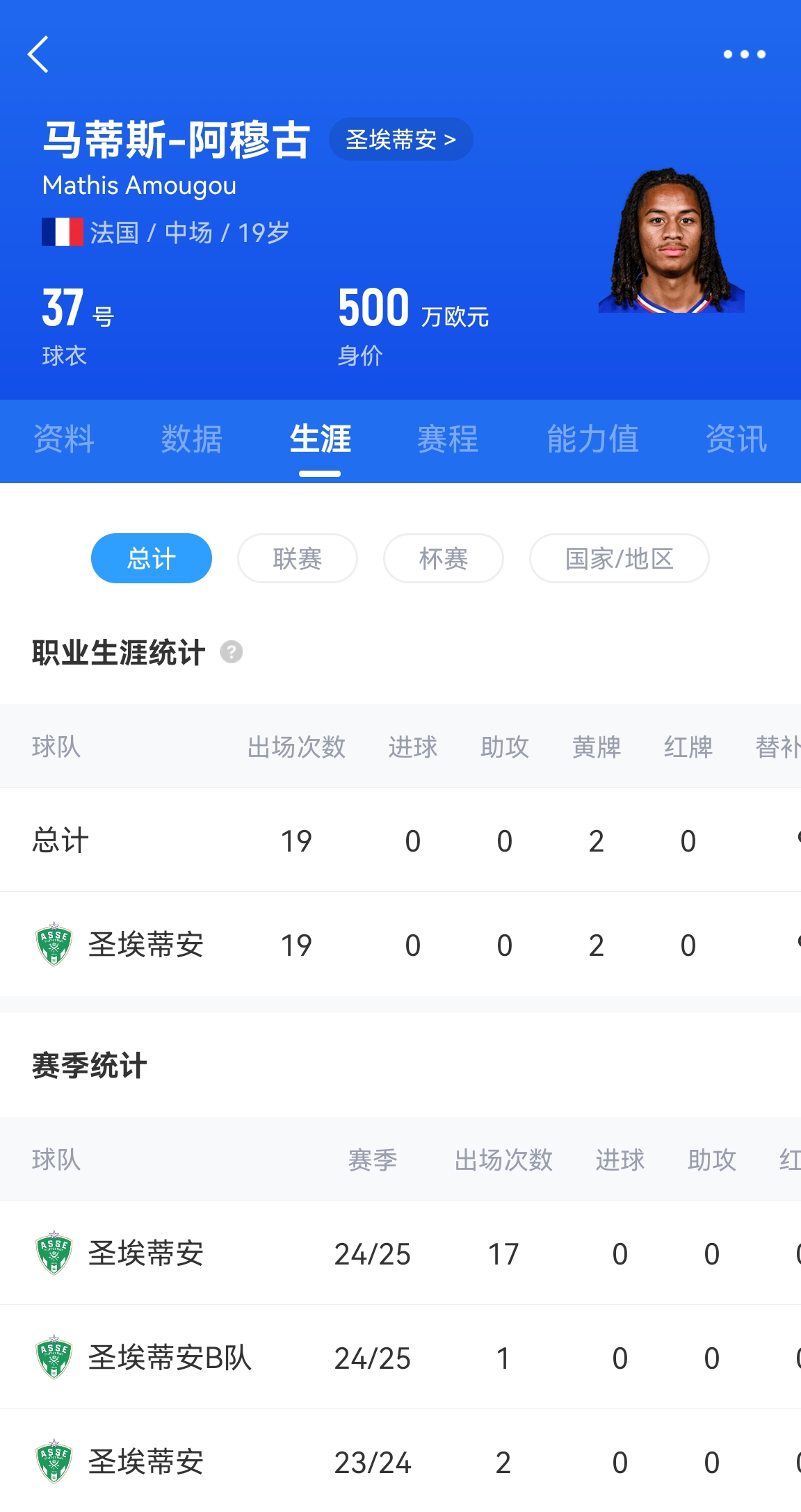 阿穆古是圣埃蒂安青訓(xùn)出身,上賽季完成一線隊(duì)首秀,截至目前共為圣埃蒂安一隊(duì)出場(chǎng)19次。