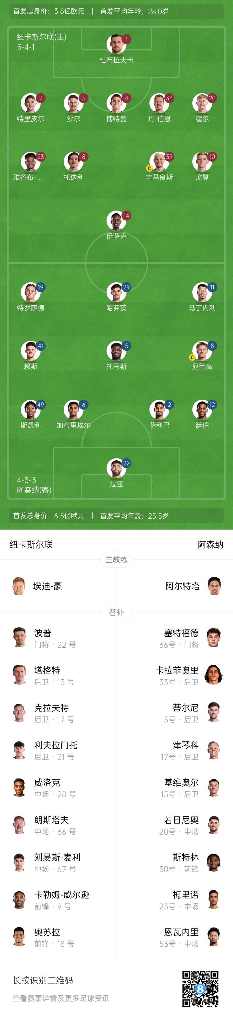 紐卡替補(bǔ):22-波普、13-塔格特、17-克拉夫特、21-利夫拉門托、28-威洛克、36-朗斯塔夫、67-劉易斯-麥利、9-卡勒姆-威爾遜、18-奧蘇拉