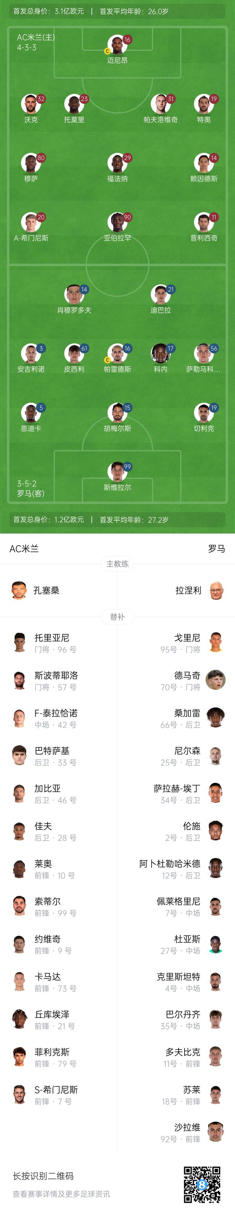 AC米蘭首發(fā):16-邁尼昂、32-沃克、23-托莫里、31-帕夫洛維奇、19-特奧、80-穆薩、29-福法納、14-賴因德斯、20-A-希門尼斯、90-亞伯拉罕、11-普利西奇