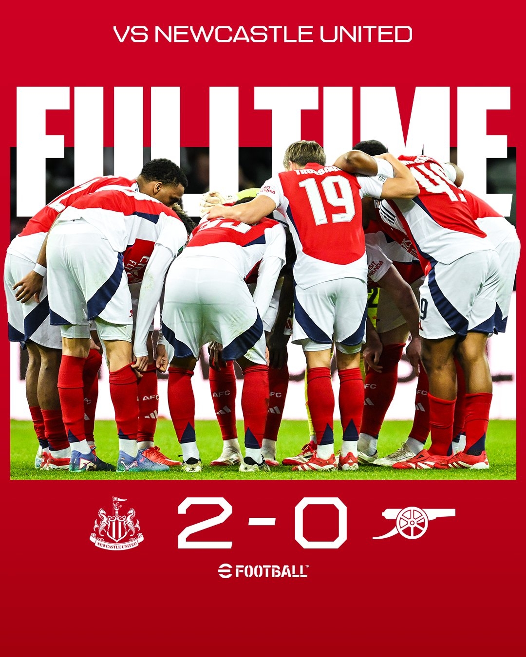 阿森納0-2遭紐卡斯爾雙殺,總比分0-4出局,無緣決賽。