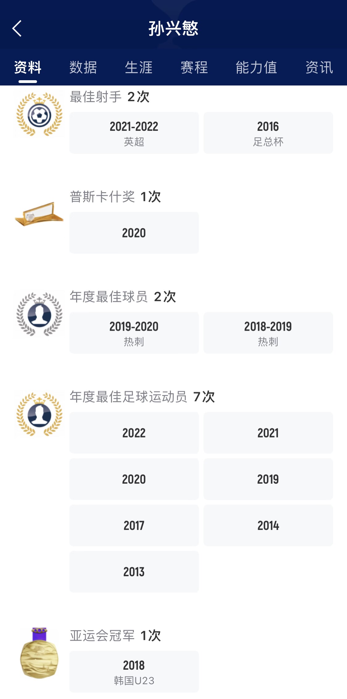 孫興慜2010年代表漢堡首次出戰(zhàn)職業(yè)聯(lián)賽,2013加盟勒沃庫森,2015年加盟熱刺,俱樂部層面尚未贏得任何冠軍榮譽。