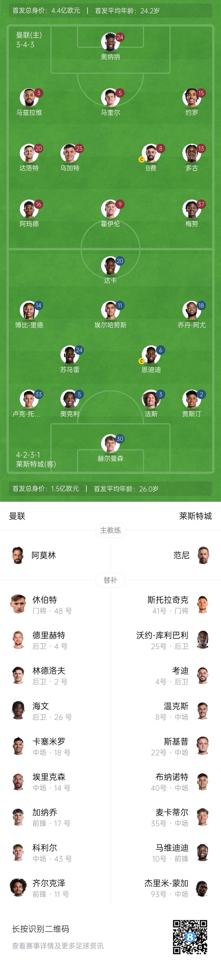 曼聯(lián)首發(fā):24-奧納納、3-馬茲拉維、5-馬奎爾、15-約羅、20-達(dá)洛特、25-烏加特、37-梅努、13-多古、8-B費、16-阿瑪?shù)?迪亞洛、9-霍伊倫