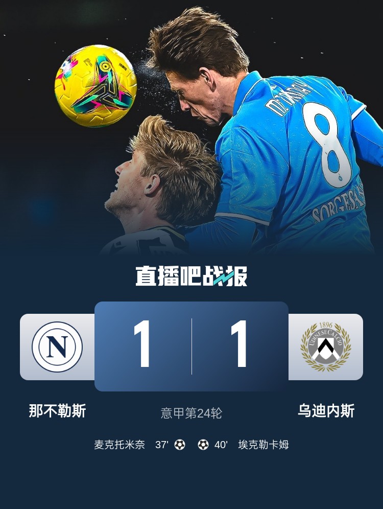 意甲第24輪,那不勒斯1-1戰(zhàn)平烏迪內(nèi)斯。上半場,麥克托米奈率先打破僵局;??死湛钒馄奖确帧O掳雸?,雙方均無建樹。