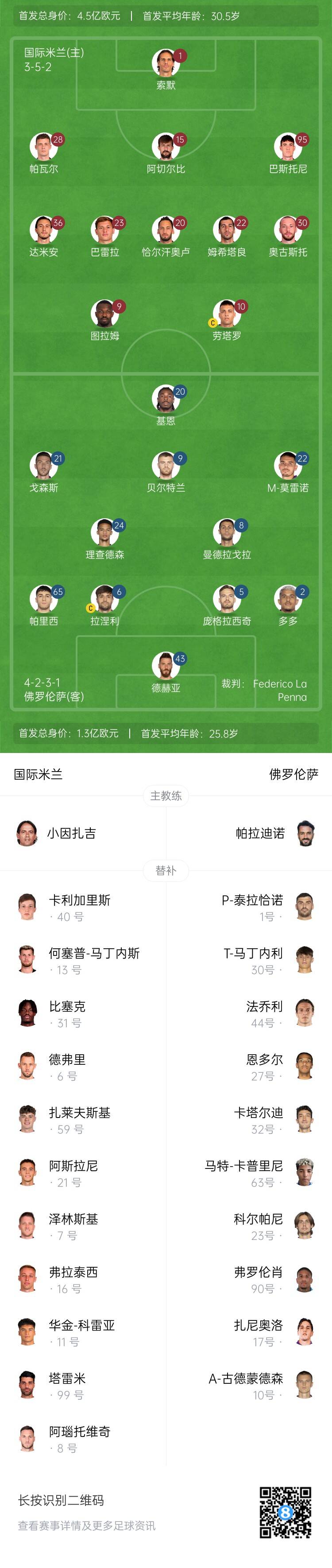 2月11日訊 意甲第24輪,國米主場對陣佛羅倫薩。賽前,官方公布了本場的首發(fā)名單。
