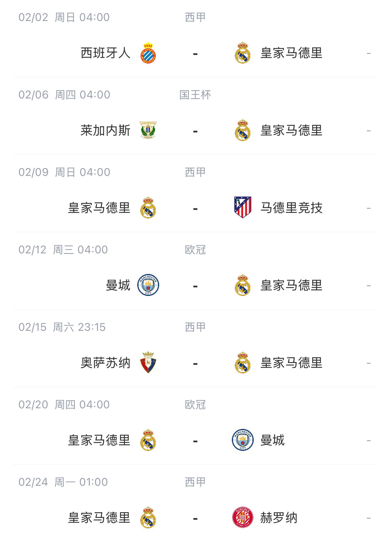 皇馬2月面臨賽程考驗,由于巴薩和馬競直通歐冠16強,皇馬比這兩位西甲爭冠對手多出兩場歐冠淘汰賽附加賽,而且附加賽對手還是曼城。